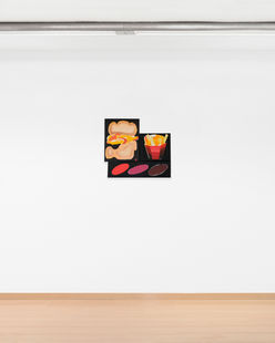 The exhibition also operates under the concept of Side Effect, which refers to the pictorial process itself. The oval shapes that recur in Dóra’s work—headphones, weights, and sauce containers—evoke the form of a pill. Like a medicine, which combines desired effects with unforeseen consequences, Dóra plans a result, but deviations and unexpected accidents appear, which end up becoming part of the work itself. Thus, through a palette and motifs that draw from the legacy of Pop Art, the artist elevates the everyday object and invites us to reconsider its meaning.
